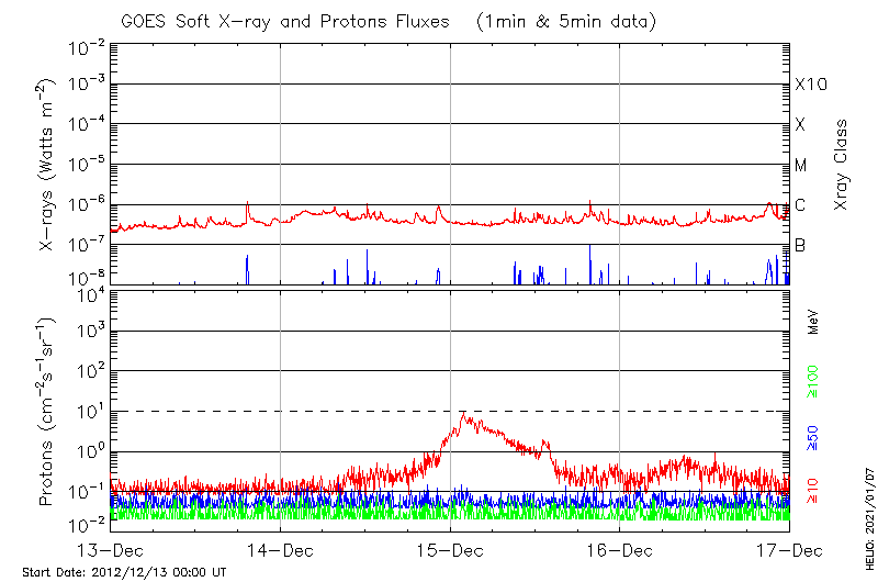 This page provides light-curves generated from GOES soft X-ray and Particle data for the date indicated at the top and the preceding three days.