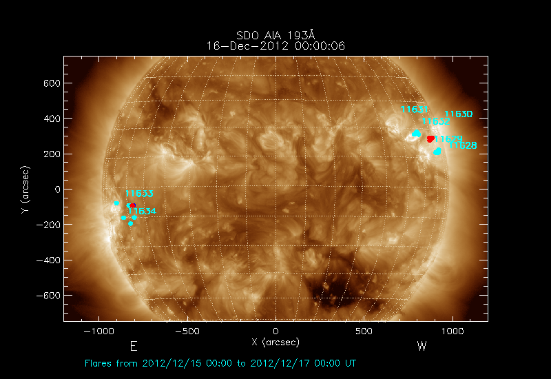 The locations of the flares over-plotted on the image are derived from the flare catalogue