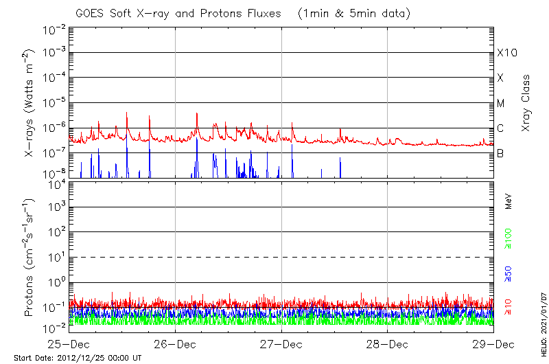 This page provides light-curves generated from GOES soft X-ray and Particle data for the date indicated at the top and the preceding three days.