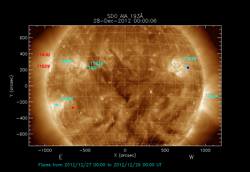 The most recent flares (≤12 hours) are shown as red dots, 12-24 hours ago as blue dots and older ones as turquoise dots.