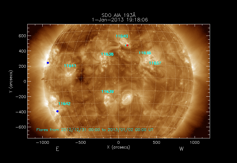 The locations of the flares over-plotted on the image are derived from the flare catalogue