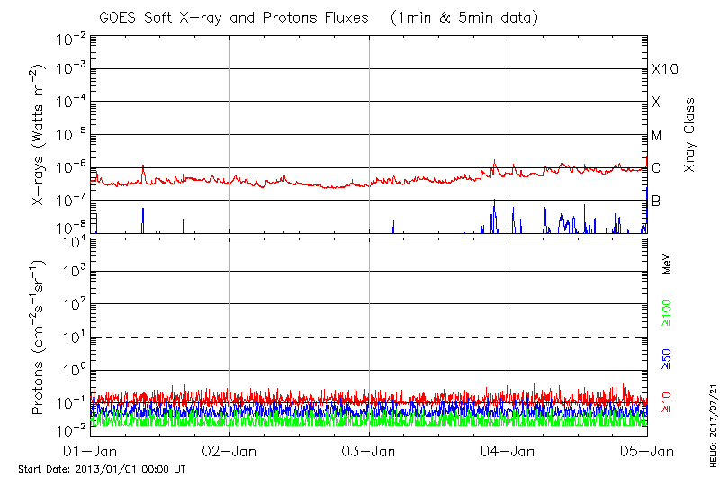 This page provides light-curves generated from GOES soft X-ray and Particle data for the date indicated at the top and the preceding three days.