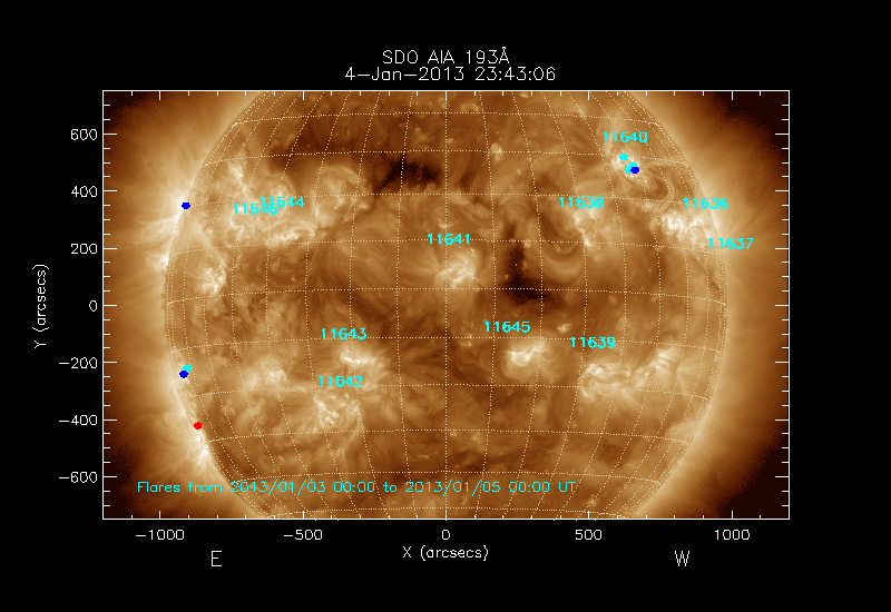 The locations of the flares over-plotted on the image are derived from the flare catalogue