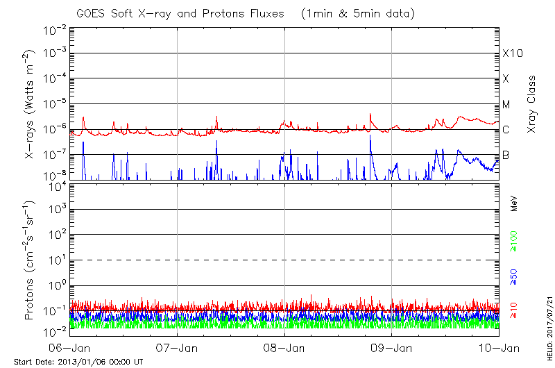 This page provides light-curves generated from GOES soft X-ray and Particle data for the date indicated at the top and the preceding three days.