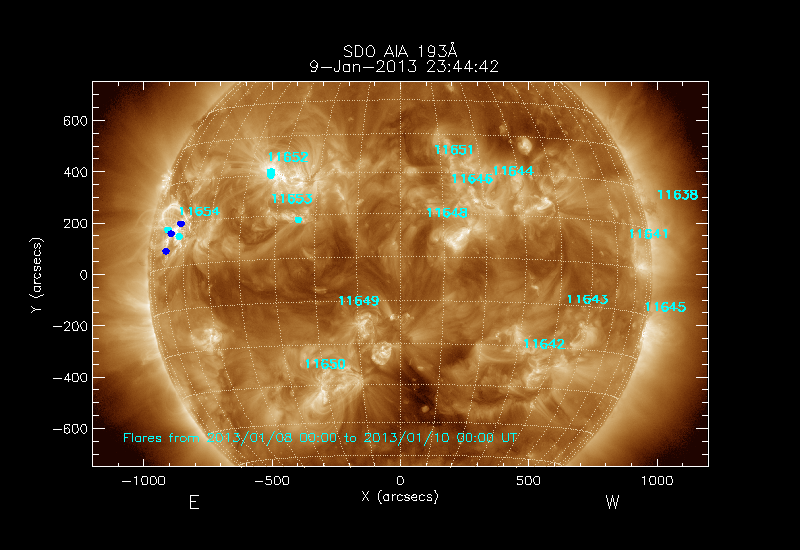 The locations of the flares over-plotted on the image are derived from the flare catalogue