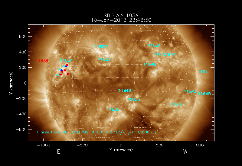 The locations of the flares over-plotted on the image are derived from the flare catalogue