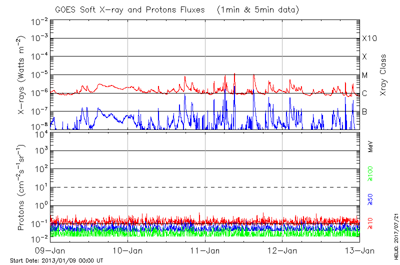 This page provides light-curves generated from GOES soft X-ray and Particle data for the date indicated at the top and the preceding three days.