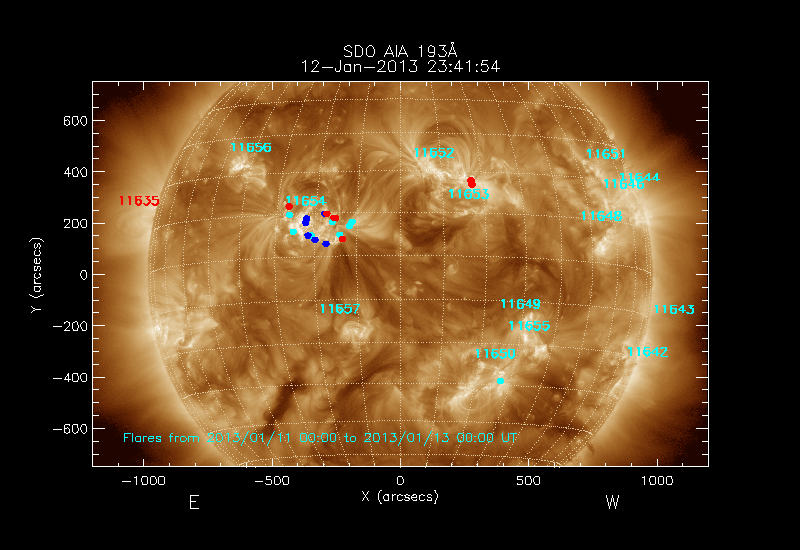 The most recent flares (≤12 hours) are shown as red dots, 12-24 hours ago as blue dots and older ones as turquoise dots.
