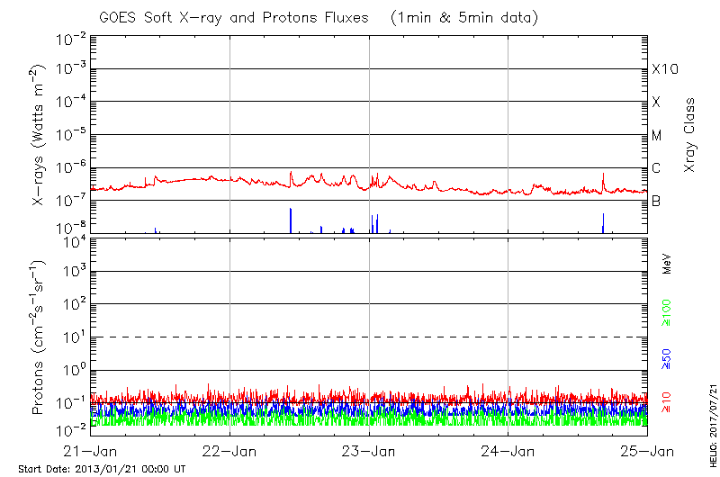 This page provides light-curves generated from GOES soft X-ray and Particle data for the date indicated at the top and the preceding three days.