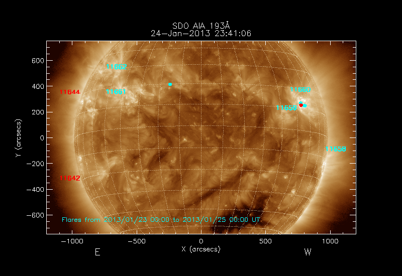 The most recent flares (≤12 hours) are shown as red dots, 12-24 hours ago as blue dots and older ones as turquoise dots.