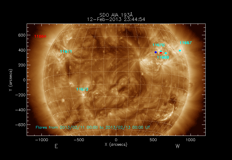 Flares for the 48 hours leading up to the time are over-plotted; these are rotated to the time of the FITS image.