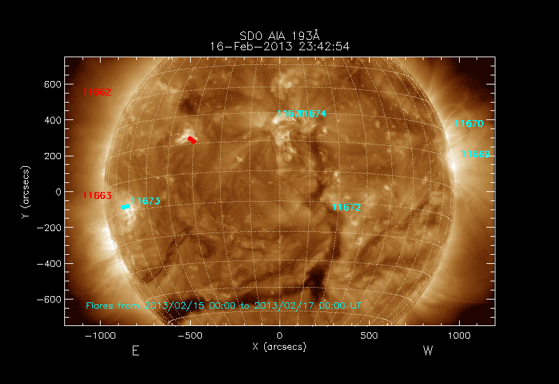 The locations of the flares over-plotted on the image are derived from the flare catalogue