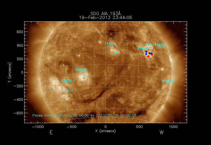 All soft X-ray flares (≥A1.0) where the location has been determined are shown; the flare locations are rotated to the time of the image