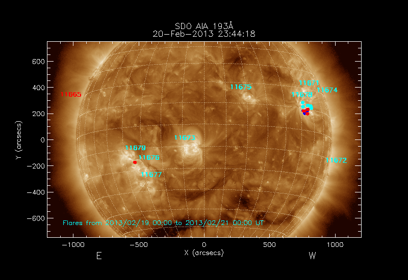 The locations of the flares over-plotted on the image are derived from the flare catalogue