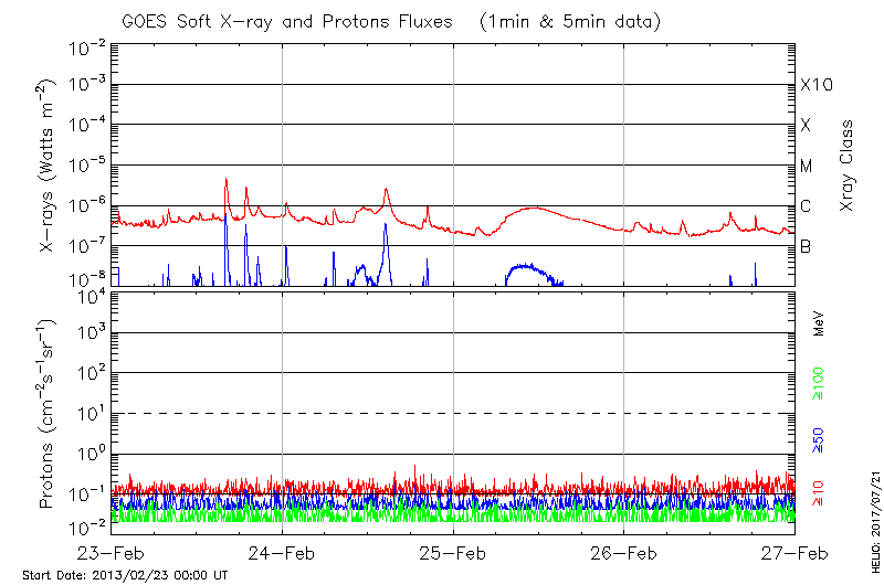 This page provides light-curves generated from GOES soft X-ray and Particle data for the date indicated at the top and the preceding three days.