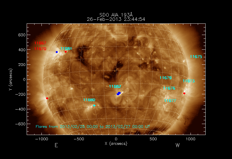 All soft X-ray flares (≥A1.0) where the location has been determined are shown; the flare locations are rotated to the time of the image