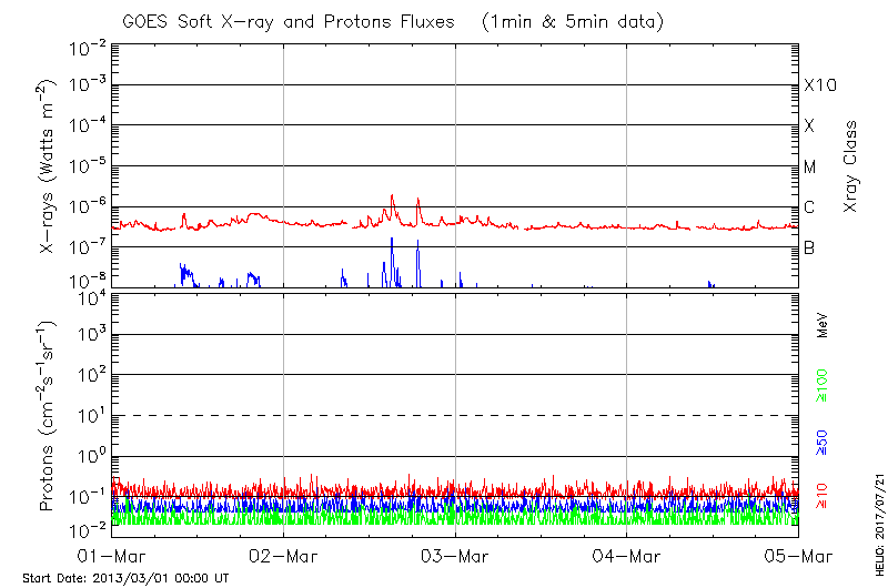 This page provides light-curves generated from GOES soft X-ray and Particle data for the date indicated at the top and the preceding three days.
