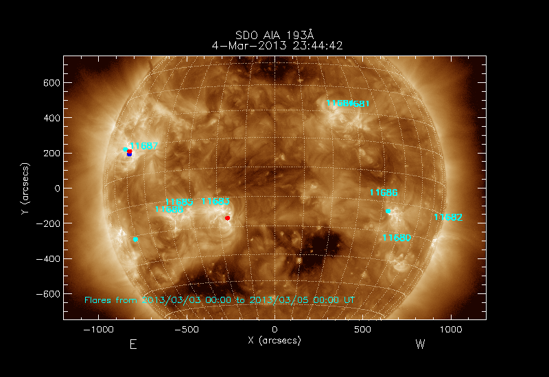 The locations of the flares over-plotted on the image are derived from the flare catalogue