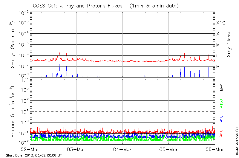 This page provides light-curves generated from GOES soft X-ray and Particle data for the date indicated at the top and the preceding three days.