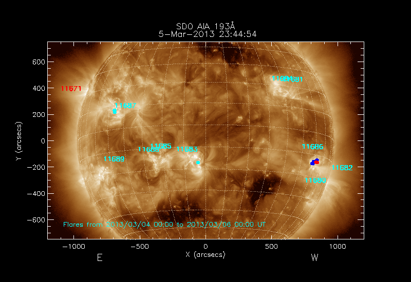 All soft X-ray flares (≥A1.0) where the location has been determined are shown; the flare locations are rotated to the time of the image