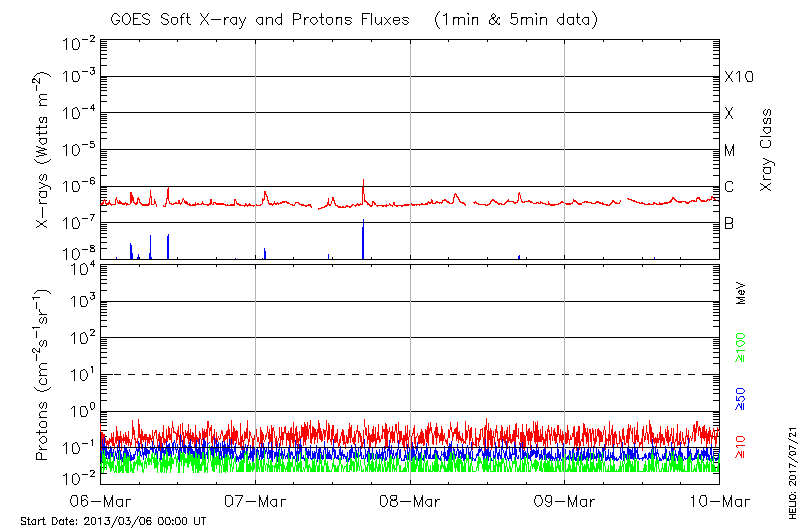 This page provides light-curves generated from GOES soft X-ray and Particle data for the date indicated at the top and the preceding three days.