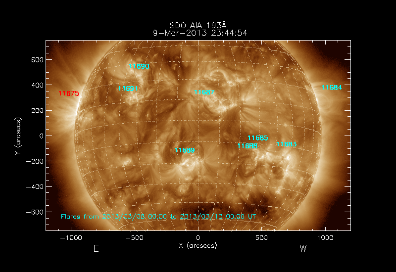 All soft X-ray flares (≥A1.0) where the location has been determined are shown; the flare locations are rotated to the time of the image