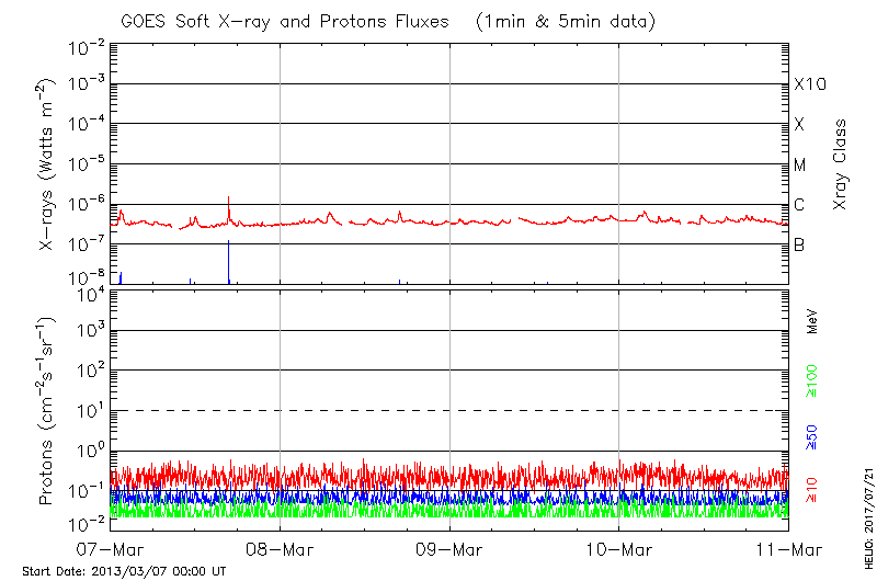 This page provides light-curves generated from GOES soft X-ray and Particle data for the date indicated at the top and the preceding three days.