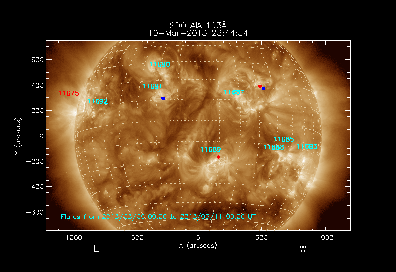 All soft X-ray flares (≥A1.0) where the location has been determined are shown; the flare locations are rotated to the time of the image