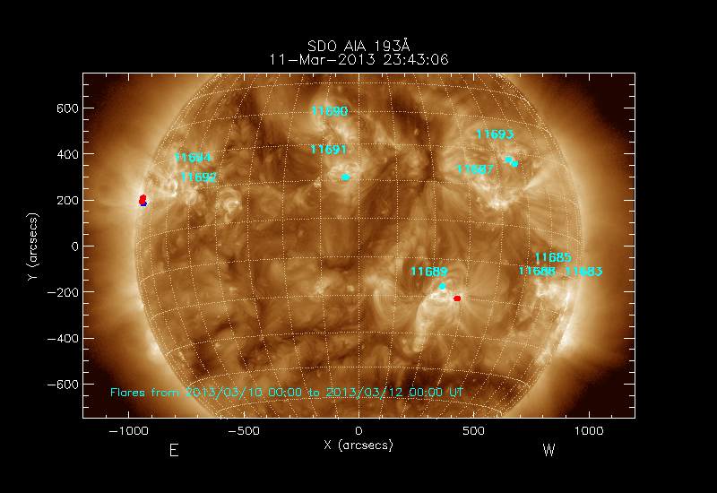 The locations of the flares over-plotted on the image are derived from the flare catalogue