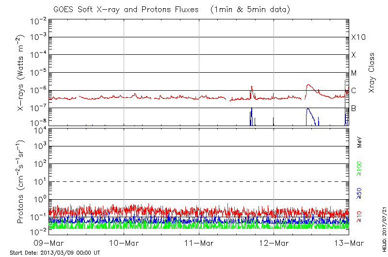 This page provides light-curves generated from GOES soft X-ray and Particle data for the date indicated at the top and the preceding three days.