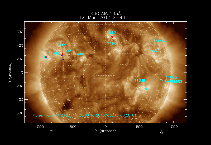 All soft X-ray flares (≥A1.0) where the location has been determined are shown; the flare locations are rotated to the time of the image
