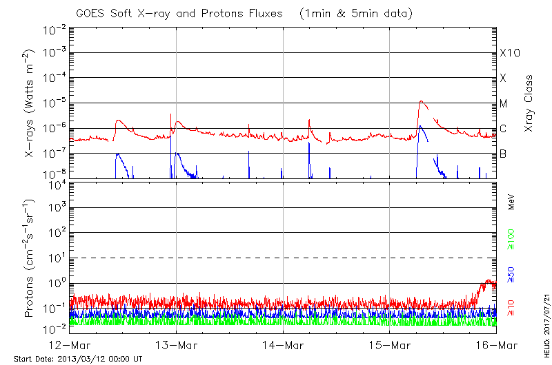 This page provides light-curves generated from GOES soft X-ray and Particle data for the date indicated at the top and the preceding three days.