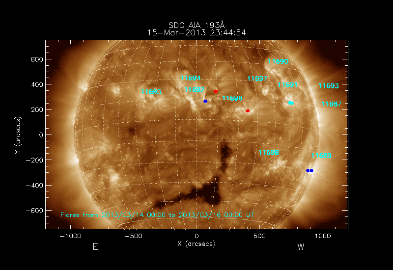 The most recent flares (≤12 hours) are shown as red dots, 12-24 hours ago as blue dots and older ones as turquoise dots.