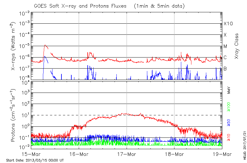 This page provides light-curves generated from GOES soft X-ray and Particle data for the date indicated at the top and the preceding three days.