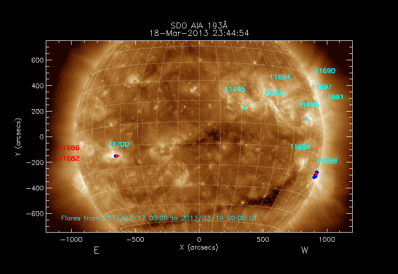 The locations of the flares over-plotted on the image are derived from the flare catalogue