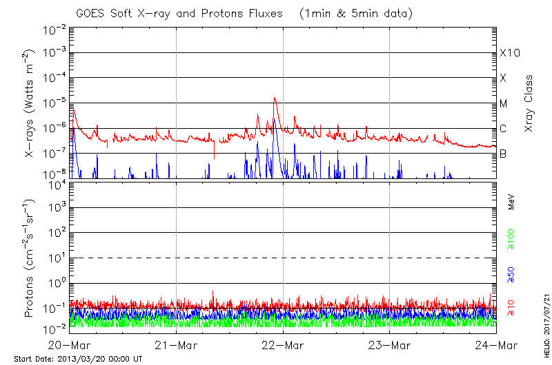 This page provides light-curves generated from GOES soft X-ray and Particle data for the date indicated at the top and the preceding three days.