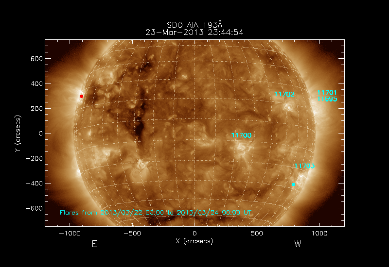dots and 24-48 hours as turquoise dots; the flare locations are rotated to the time of the image.