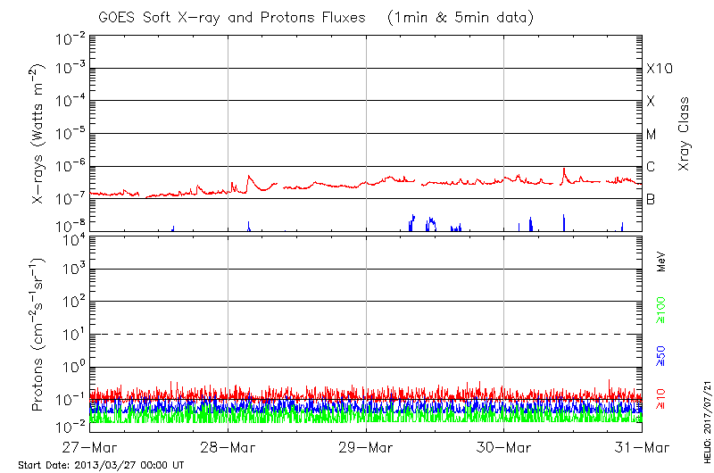 This page provides light-curves generated from GOES soft X-ray and Particle data for the date indicated at the top and the preceding three days.