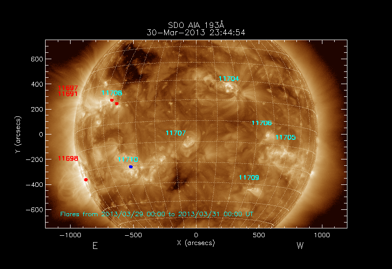 The locations of the flares over-plotted on the image are derived from the flare catalogue