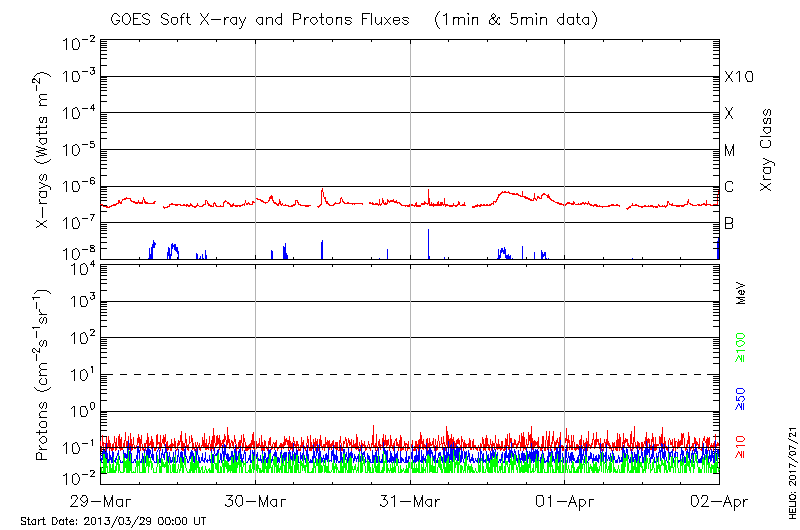 This page provides light-curves generated from GOES soft X-ray and Particle data for the date indicated at the top and the preceding three days.