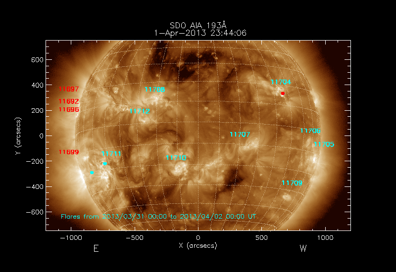The locations of the flares over-plotted on the image are derived from the flare catalogue