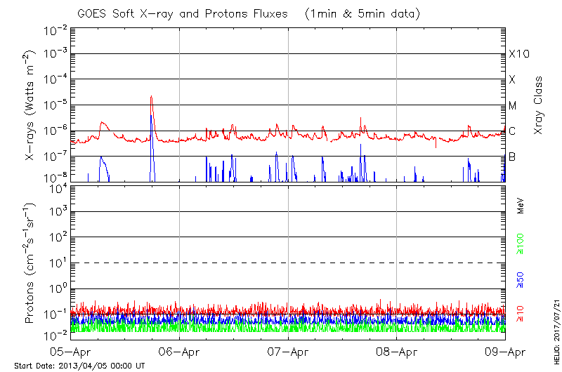 This page provides light-curves generated from GOES soft X-ray and Particle data for the date indicated at the top and the preceding three days.