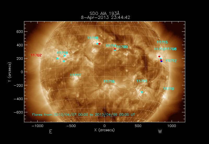The locations of the flares over-plotted on the image are derived from the flare catalogue
