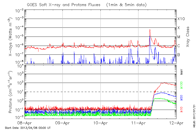 This page provides light-curves generated from GOES soft X-ray and Particle data for the date indicated at the top and the preceding three days.