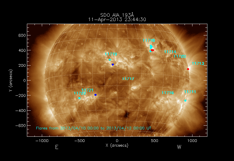 The locations of the flares over-plotted on the image are derived from the flare catalogue