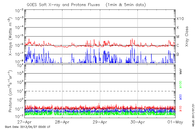 This page provides light-curves generated from GOES soft X-ray and Particle data for the date indicated at the top and the preceding three days.