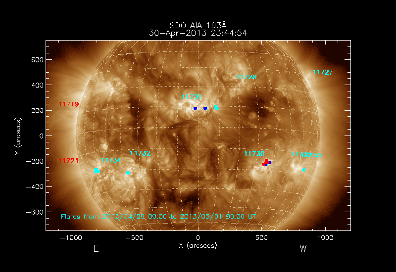 The locations of the flares over-plotted on the image are derived from the flare catalogue