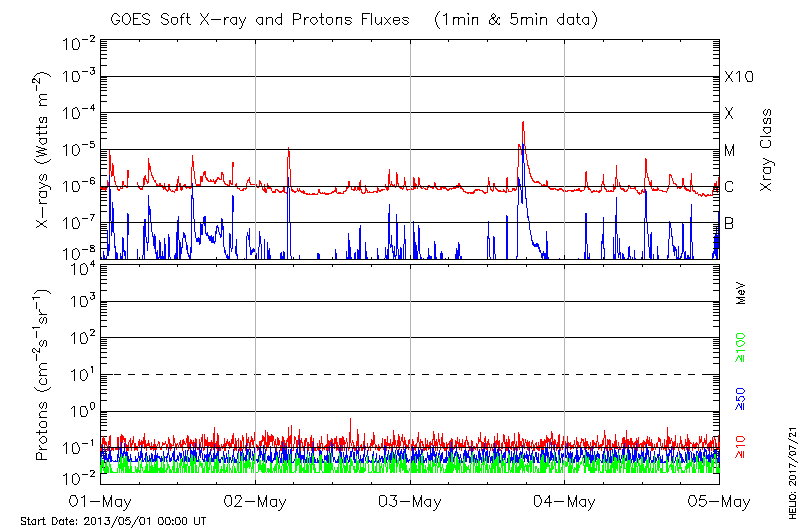 This page provides light-curves generated from GOES soft X-ray and Particle data for the date indicated at the top and the preceding three days.
