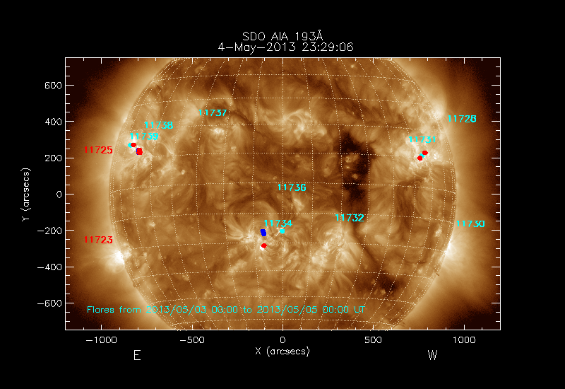 The most recent flares (≤12 hours) are shown as red dots, 12-24 hours ago as blue dots and older ones as turquoise dots.