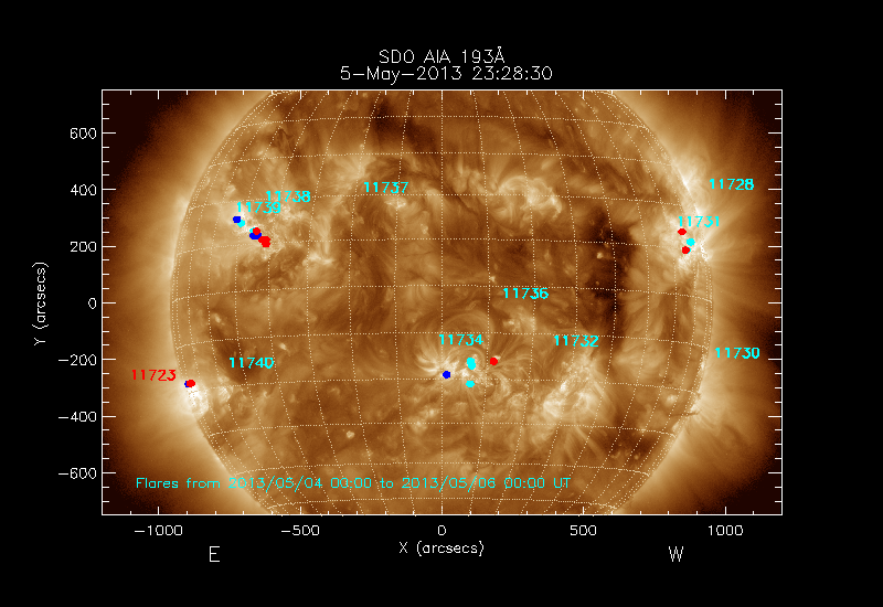 The locations of the flares over-plotted on the image are derived from the flare catalogue